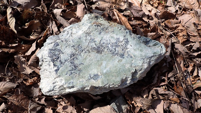 道路を歩いていると路肩に蛇紋岩の塊が落ちています。