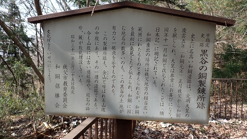 和銅産出の場所は秩父地方の相当広い範囲に渡るものと考えられるが、和銅にちなむ地名の数多いのも、この黒谷の土地が有力な一拠点を示すものである。