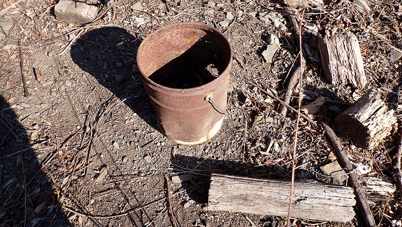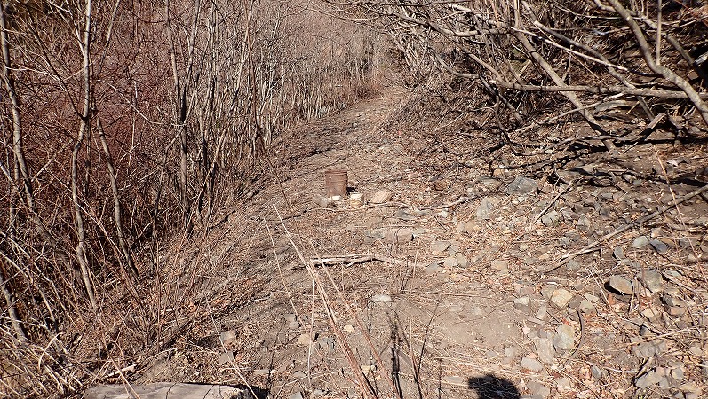 作業道の真ん中には金属製の大きな缶と朽ちた丸太が置いてありました。