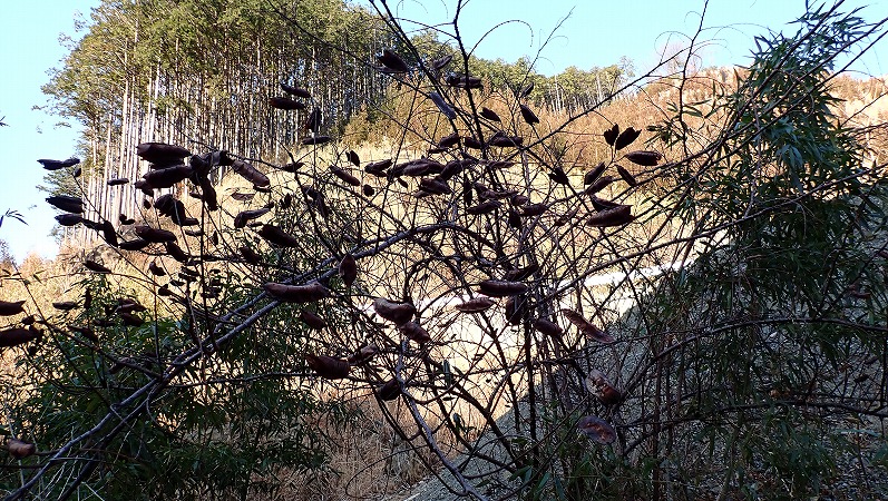 ちなみにこの時は、どこの沢にもこのマメっぽい美のなるトゲトゲの木が生えており、藪を進むたびにウエアに引っかかたり刺さったりして大変です。