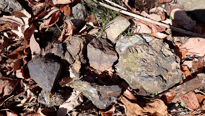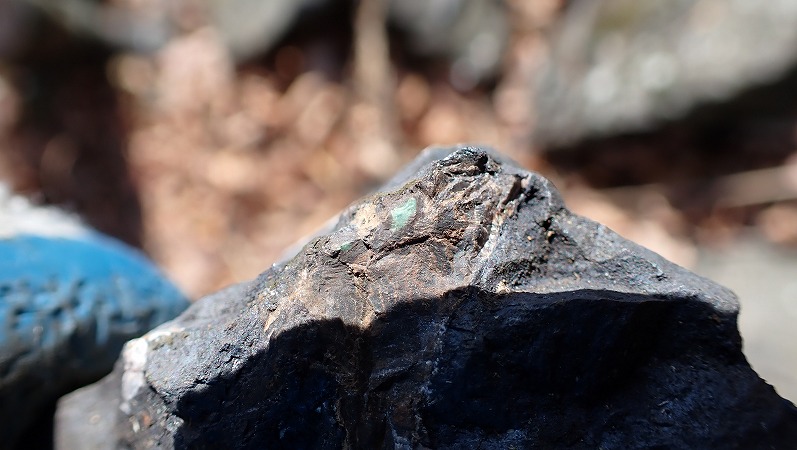 坑口の付近にはマンガンが含まれている大きな黒い石がゴロゴロしています。
