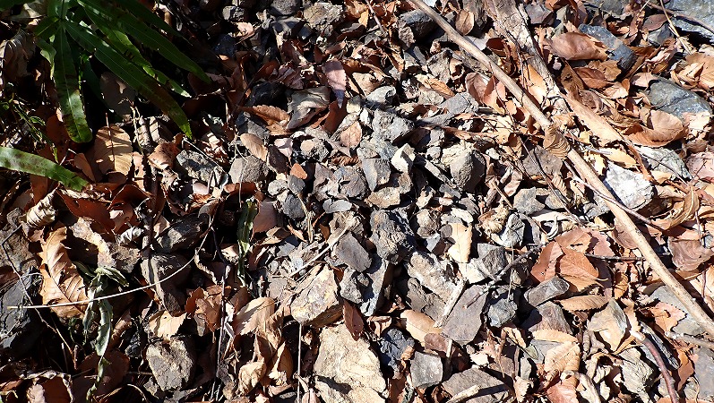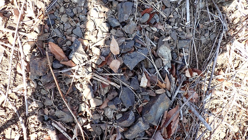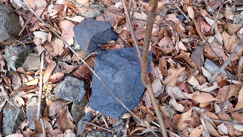 斜面を登ると二酸化マンガンらしき黒い石も増えてきます。