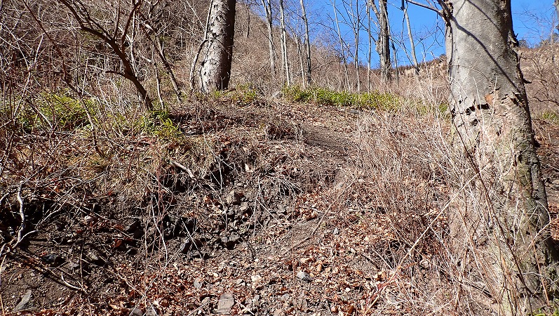 この沢には以前は林業用のコンクリート敷の道が有った様ですが、大雨で崩れた様でこの有り様。