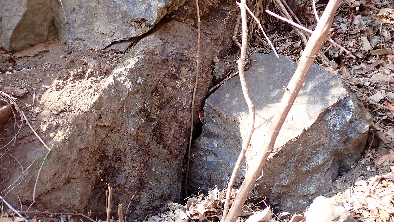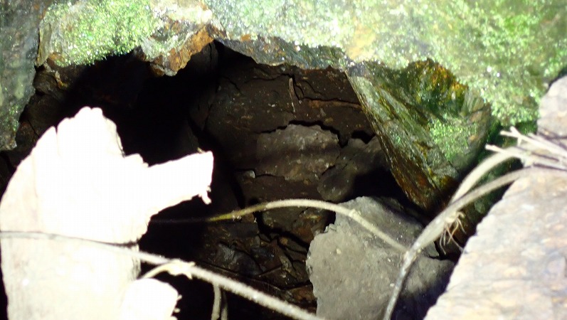 そして落ちて来たと思われる石の隙間には、坑道っぽい空間も有りますが、狭すぎて奥まで確認できず。