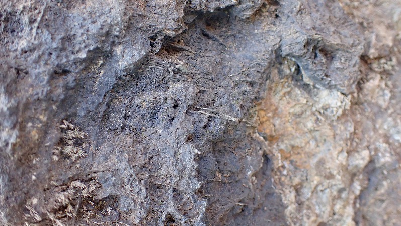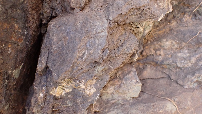 露頭の表面には二酸化マンガンと思われる黒い石が付着しています。