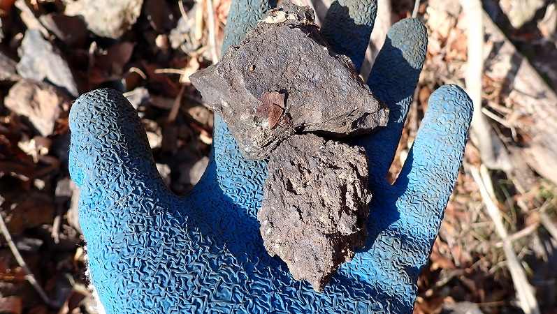 沢を下って入り口付近に近づくと、別の斜面にマンガン鉱石が落ちているのを発見。