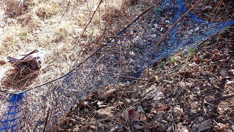 この先にも別の坑口が有るのではと思い、斜面を登りましたが害獣除けネットと藪に阻まれて進めず。
