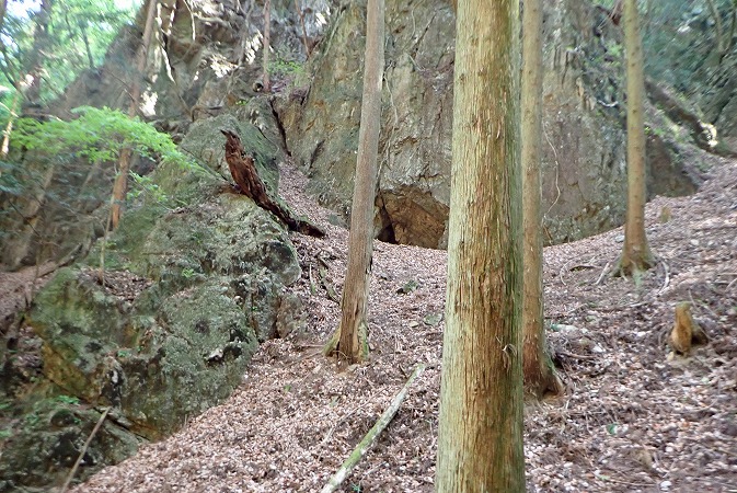 石が沢山落ちているを登ると、怪しい窪み。