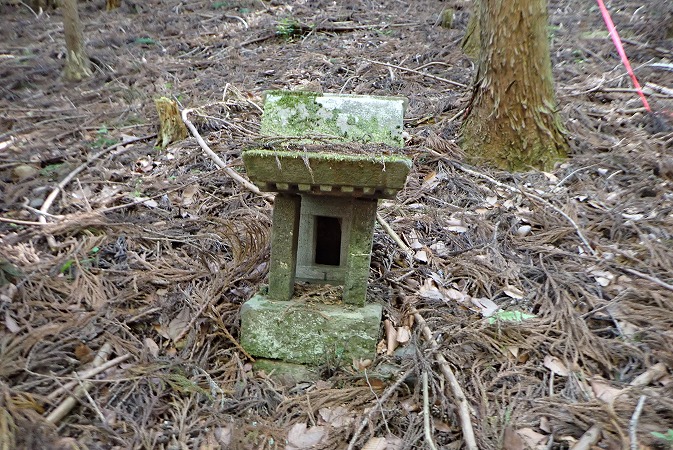 山の中をウロウロしていたら、植林された杉林の中にポツンと祠が有りました。