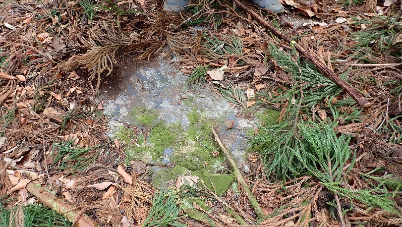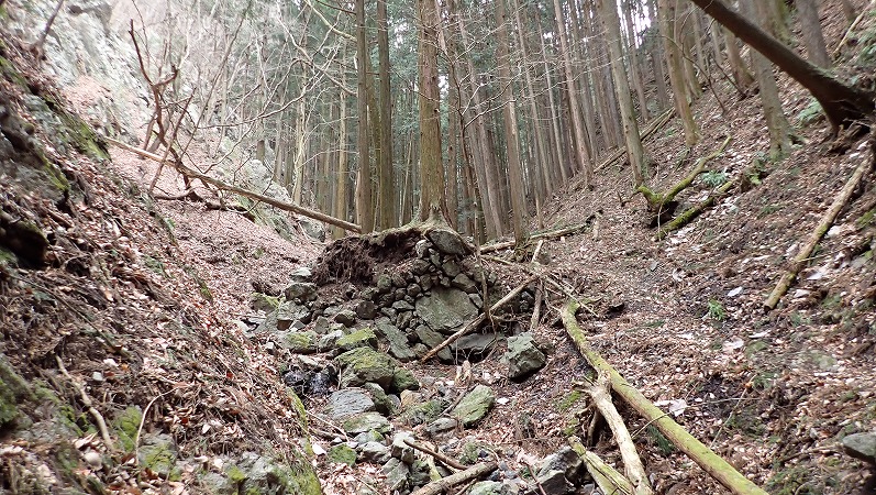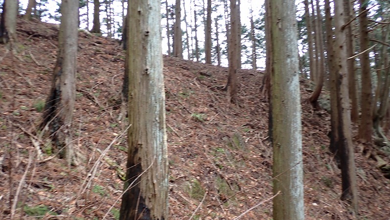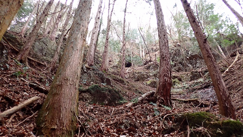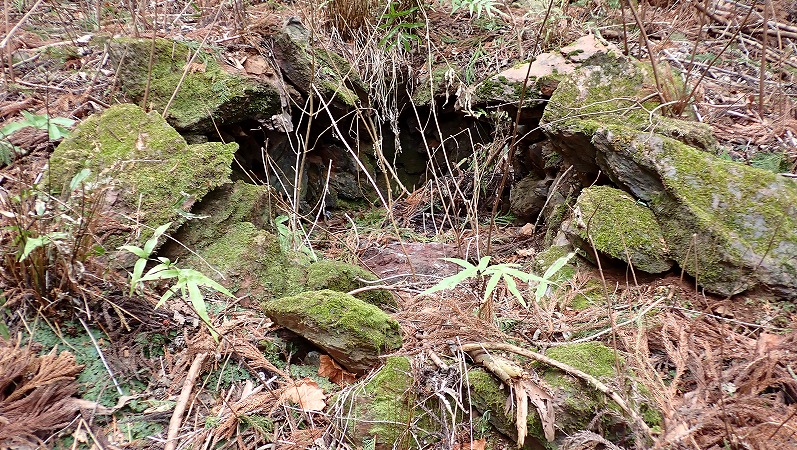 尾根に近い緩やかになった場所に炭焼き窯の跡。