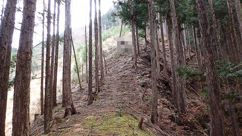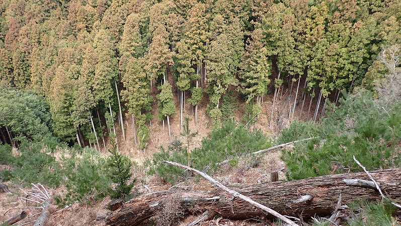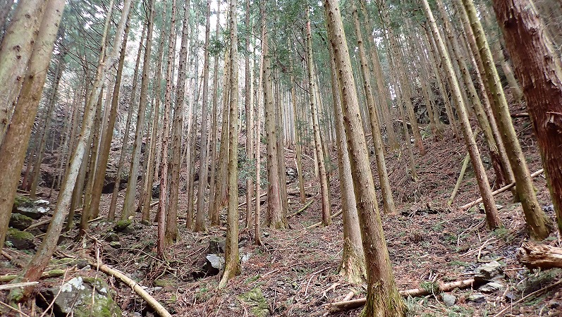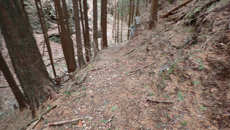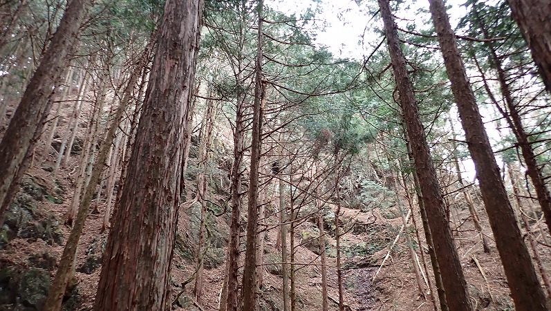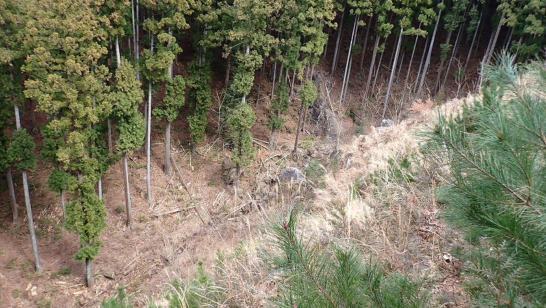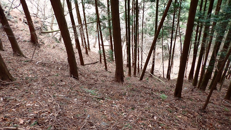 沢沿いの斜面、下から見たら斜度がそれほど無さそうでしたが、登ってみると結構斜度が有ってきついですね。