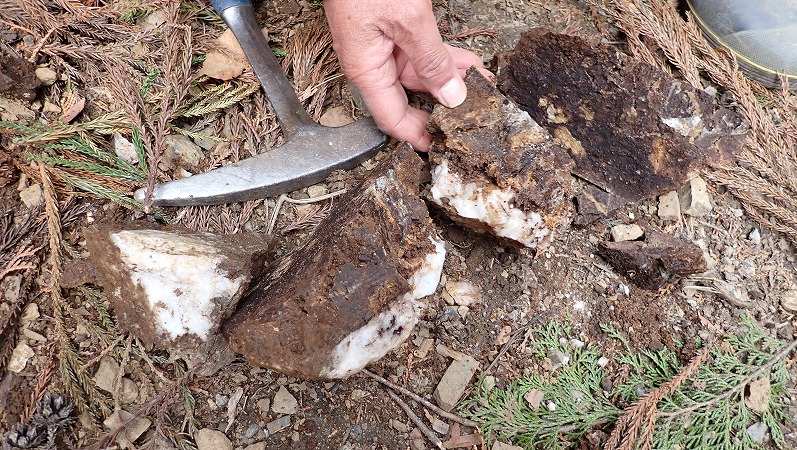 露頭に石英脈が有ったので割ってみます。しかし、残念ながら極小水晶が有ったのみ。