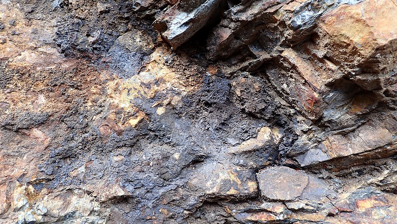沢を登りながら足元の岩を見ると、この付近にも所々マンガンと思われる黒い鉱物が見られます。