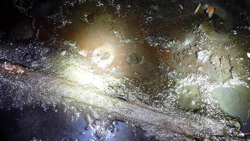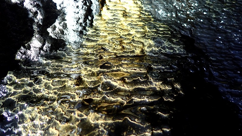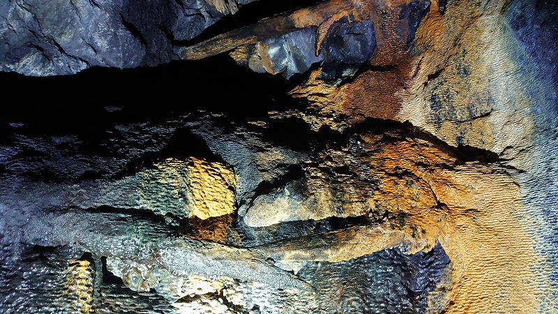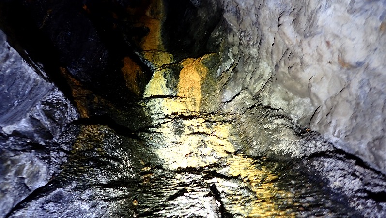そしてその上部からは石灰分だかマンガンだかが混じった水が流れ出ているようでで、ちょっとした鍾乳洞のようになっています。