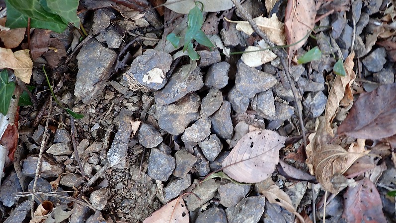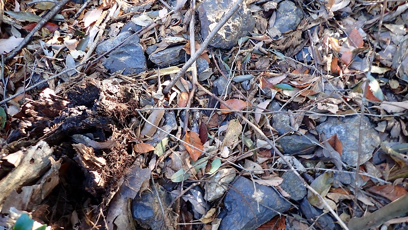 藪に入ると早速マンガン採掘のズリ石らしき黒い石。