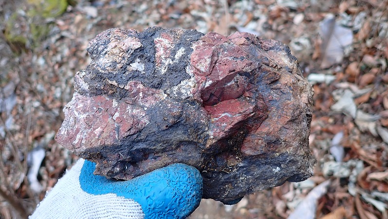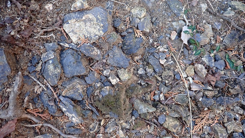 斜面にはマンガン鉱山の黒いズリ石も落ちています。