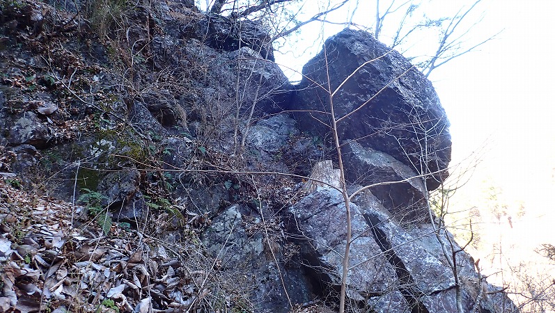 この黒い岩の上部に有るのですが、ここは登れないので大きく回っていきます。