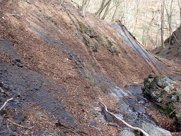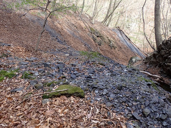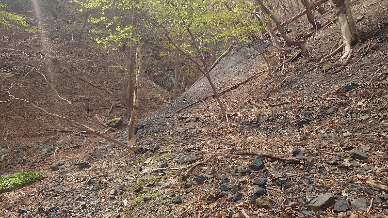 沢沿いに少し進むと、ズリ斜面地帯。