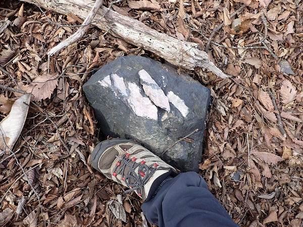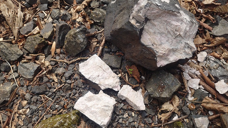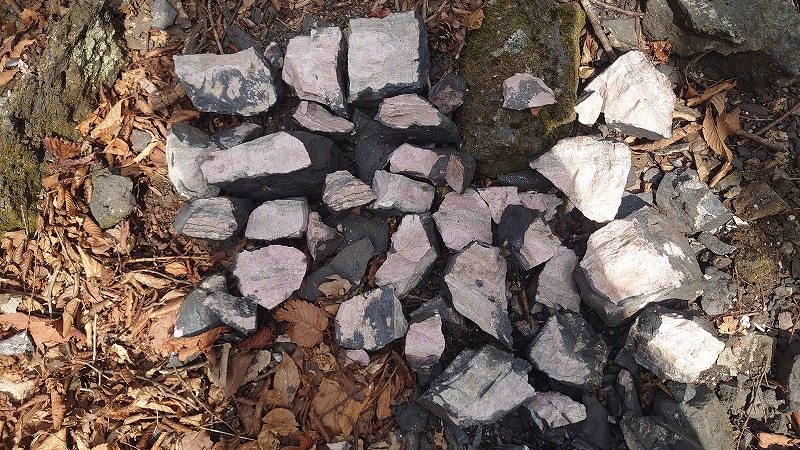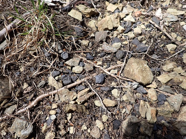 しばらく進むと、尾根沿いに急に出てくる小割されたマンガン鉱石が落ちている地帯。