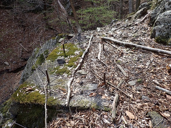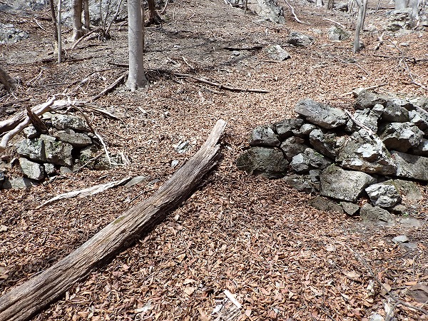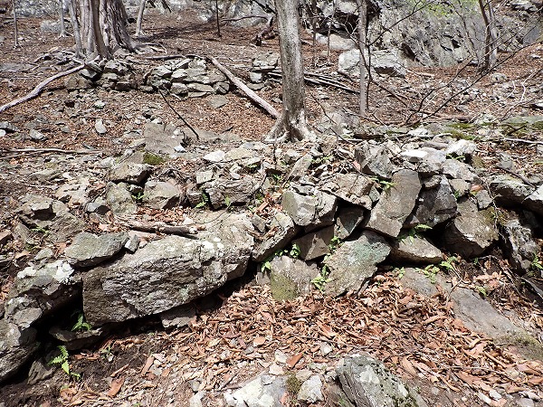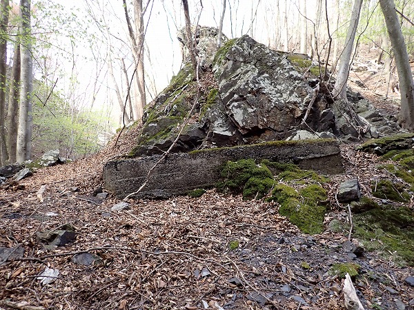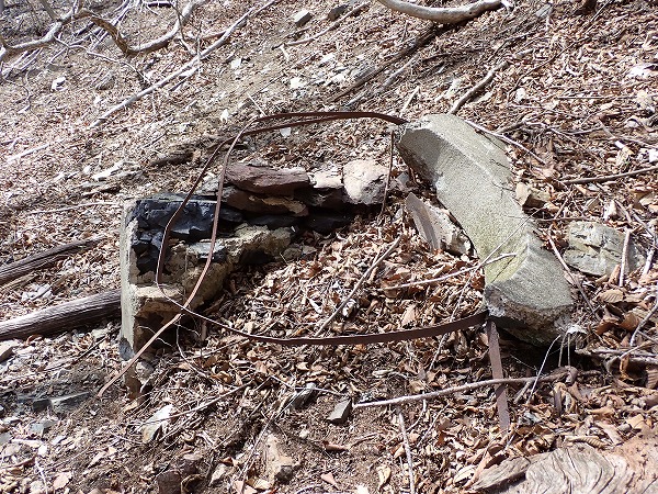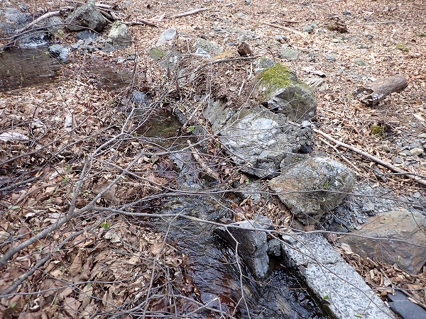 沢付近に下りると、昭和鉱山奥山坑の作業小屋跡と思われる石組付近に到達。