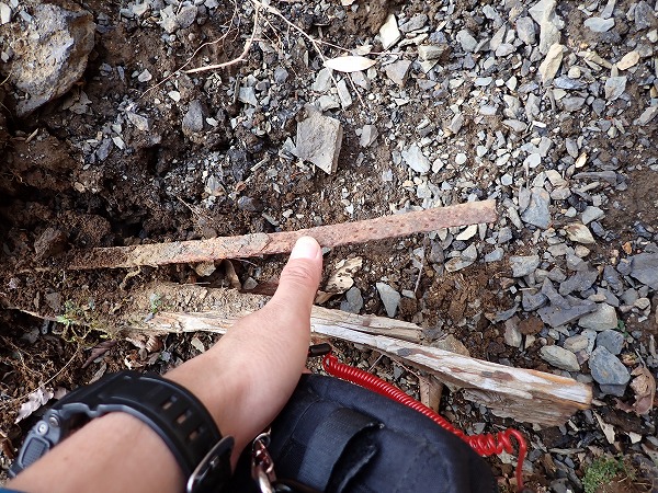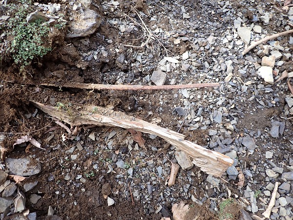ズリの中には、木製レールと思われる残骸。