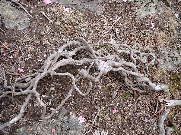 尾根沿いの岩肌に生える植物の根。