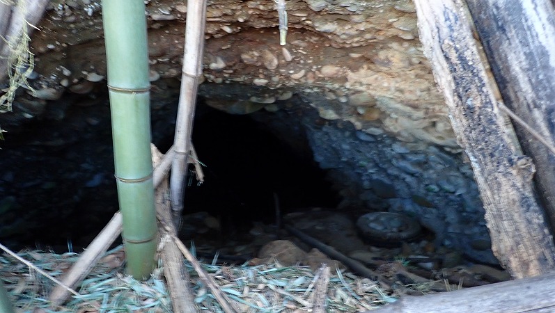 目印の裏は竹藪なので、藪漕ぎして進むといきなり坑口が出てきます。