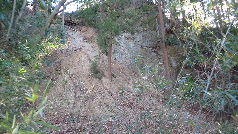 露頭の下あたりが怪しいのですが、土砂が崩れて埋まっています。